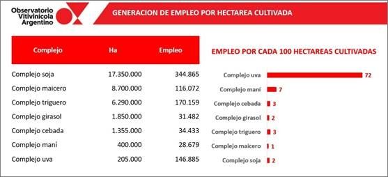 Esto es así porque por cada 100 hectáreas cultivadas y en producción, la vitivinicultura genera alrededor de 72 puestos de trabajo. Es decir, diez veces más que los empleos que genera el maní (7 por cada 100 hectáreas en producción) y ampliamente superador a la cantidad de mano de obra que demandan los complejos exportadores de cebada, girasol, trigo, maíz y soja. Todos estos sectores emplean a entre 1 y 3 personas por cada 100 hectáreas cultivadas.