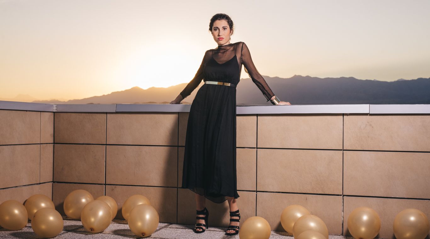 Vestido (Jazmín Chebar) y zapatos negros con brillos (Petit Maison).