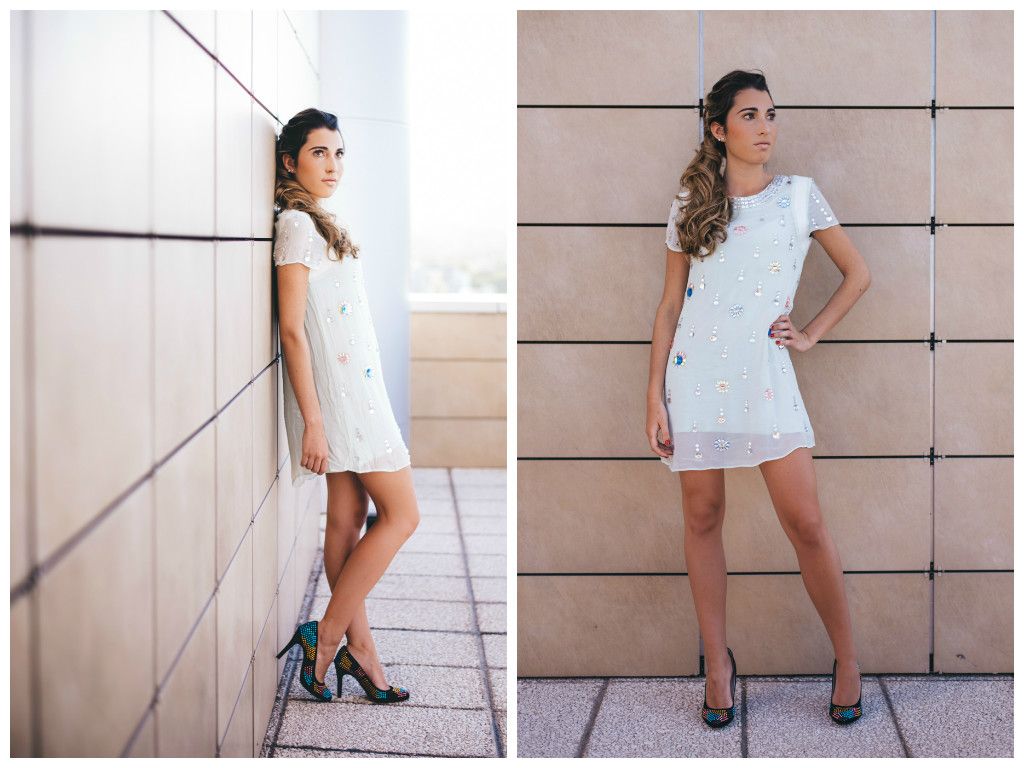 Vestido corto en blanco con detalles dorados y sandalias doradas (Espacio Arístides).
