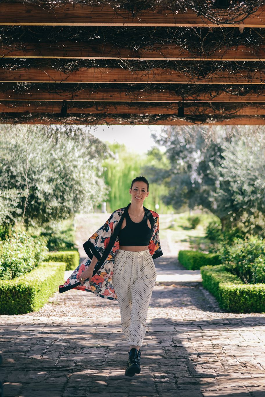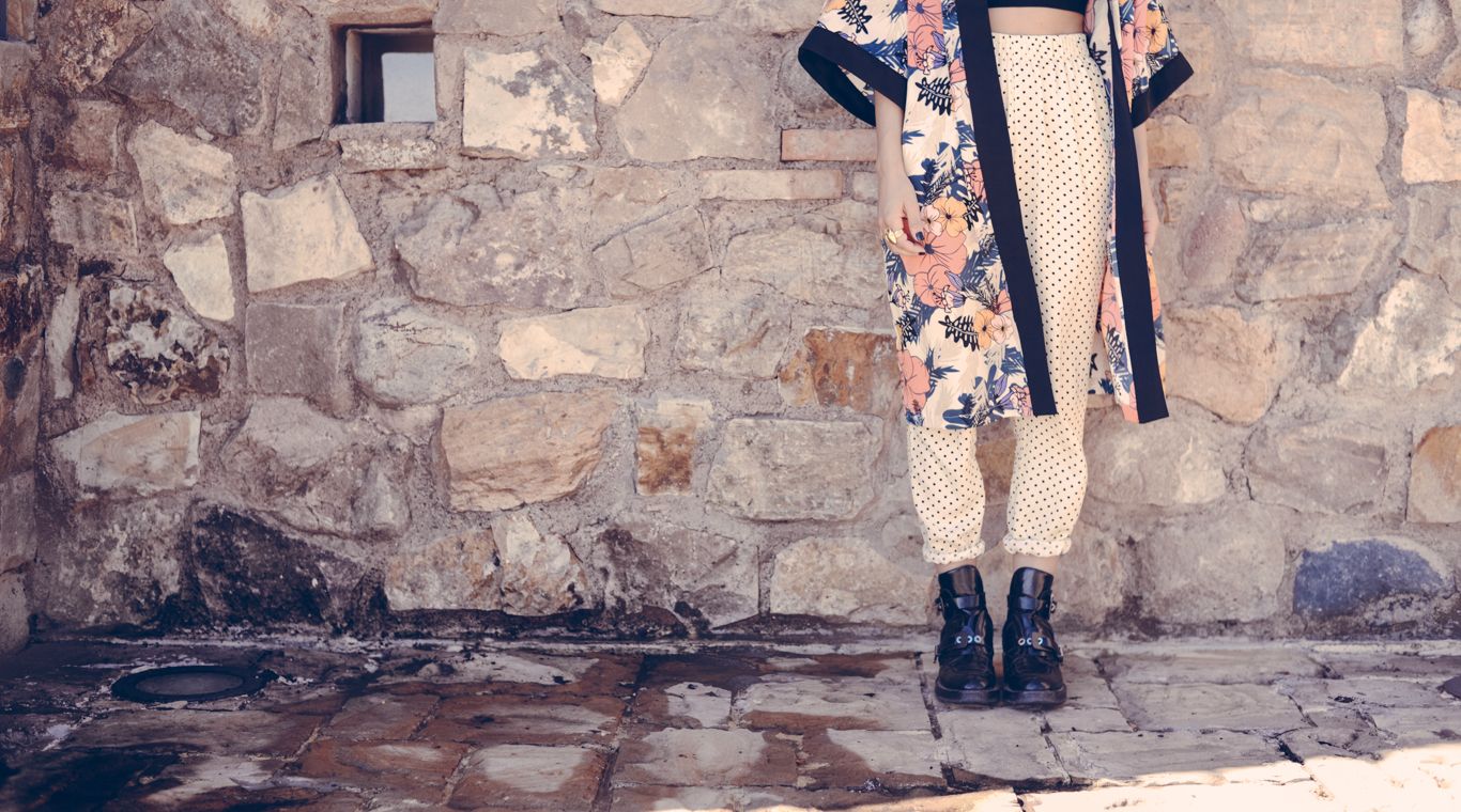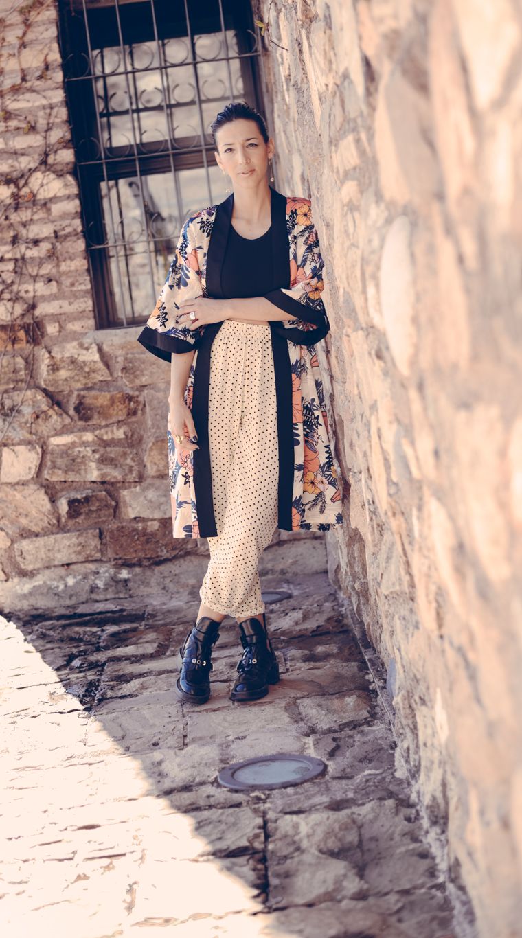 Emi se animó a mezclar: lunares y flores. El crop top y el kimono llegaron para quedarse.