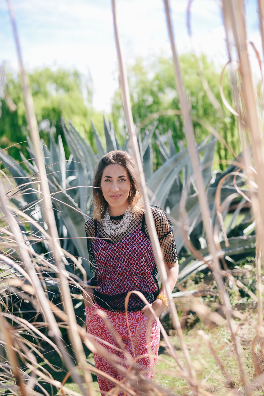Flor eligió un mono estampado y una remera de red de Complot. Acompañó el outfit con uno de sus collares preferidos.