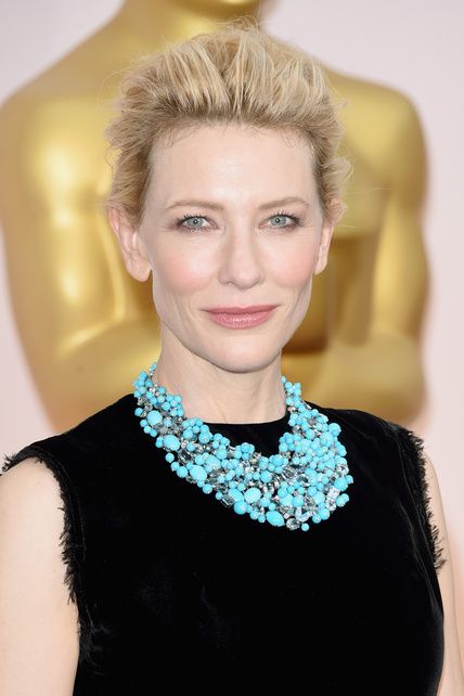 Cate Blanchet. Make up natural que destaca sus intensos ojos celestes y un recogido desprolijo. Un look muy minimalista, divino su collar.