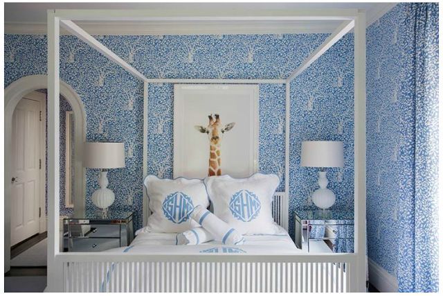 Una propuesta diferente en celeste. La cama con baldaquino y las mesas de luz espejadas le aportan el lado femenino.