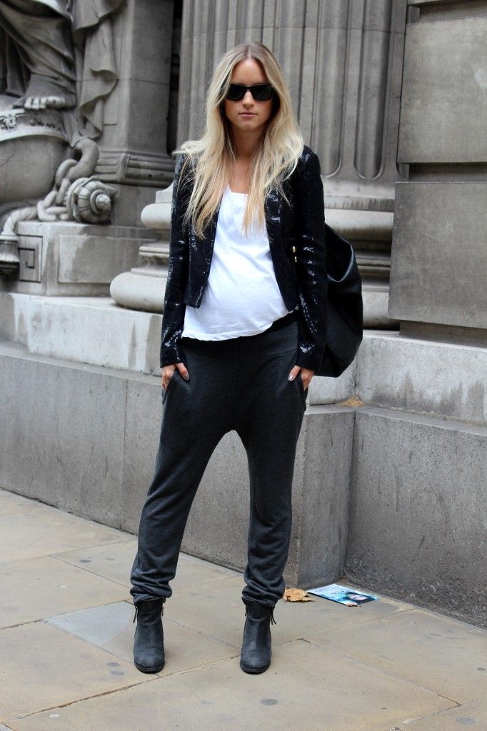 Ya es inevitable disimular, por eso, resulta ideal elegir qué se quiere resaltar más, si la parte de arriba o la de abajo, y según nuestro fuerte elegir pantalones sueltos tipo los pantalones pijama (están en boga, para suerte de las embarazadas) y algo más al cuerpo arriba. Sino al revés, alguna blusa suelta o maxi sweater con chupines o leggins abajo. Ambas combinaciones son exitosas y se puede ir variando con ellas.