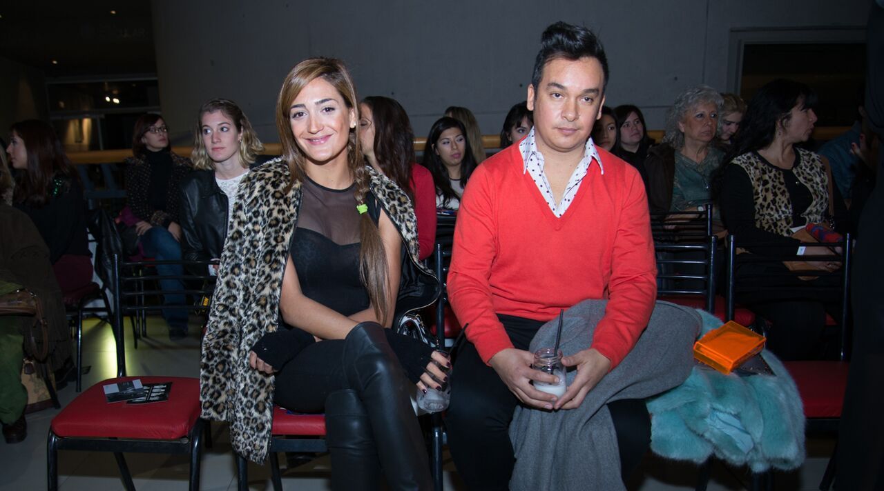 Antonella Tapia y su compañero. Leopardo, transparencias, las infaltables bucaneras de la temporada y mitones negros para la noche fría. Él, con colores fuertes y un peinado más jugado.