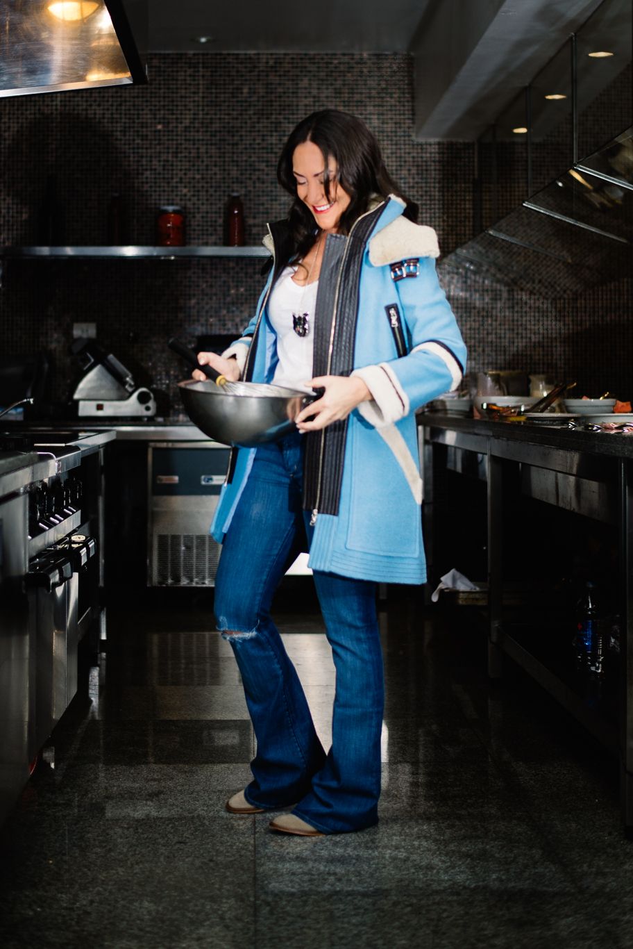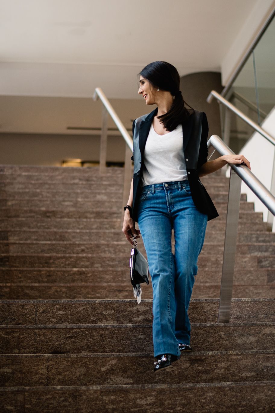 Su look Jean led. Ella llevaba un pantalón de corte bootcut (no tan amplio como el oxford) y recto de un azul claro. Para acompañar sus actividades profesionales lo arreglamos y llevamos a un look más chic con un saco sastre negro en tela combinada y unos scarpines con detalles de piedras. Sumamos un clutch con piedras estilo fleco.