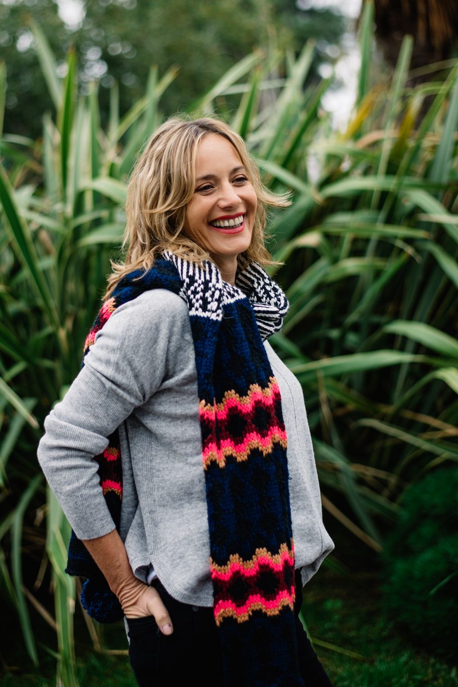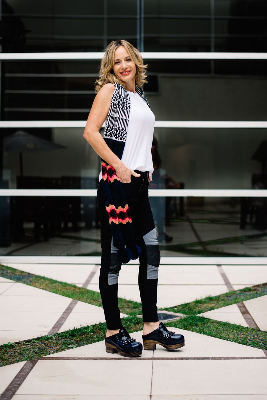 Su look Jean rolling. Tiene un estilo muy relajado y para seguir con eso pero probando algo distinto usó un jean negro con recortes en cuero y gris en la rodilla. Para la parte de arriba un sweater clásico gris de lana de corte net, unos suecos azules y bufanda llena de colores para levantar.