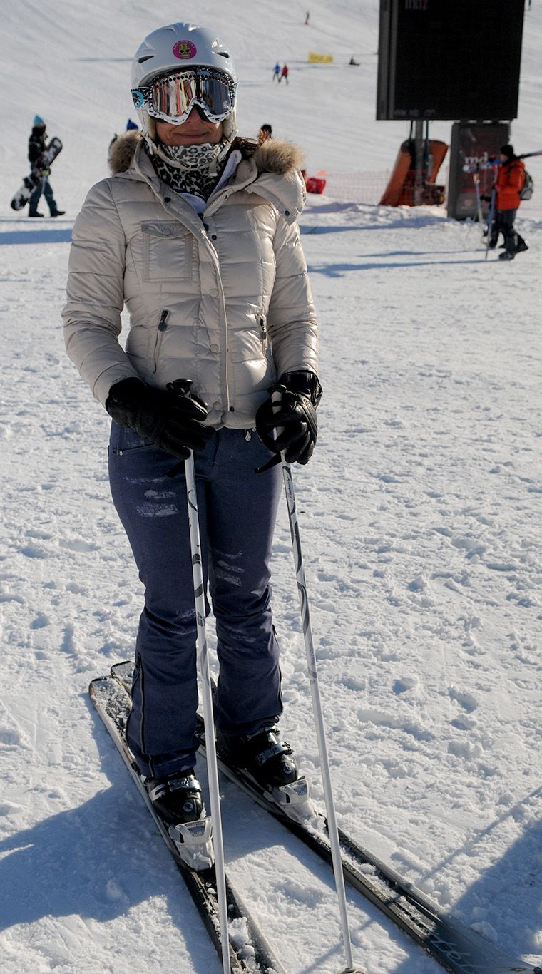 Genial la idea la de usar un pantalón de ski tipo jean, con roturas y desgaste incluido. Muy novedoso. Además le agregó un touch de animal print con su abrigo para el cuello, que iba perfecto con el color de su campera. Amé las antiparras.