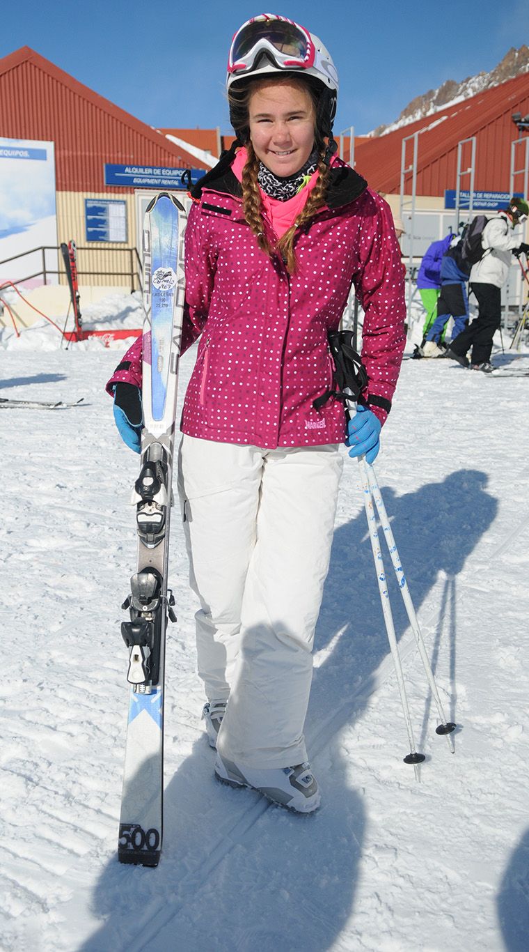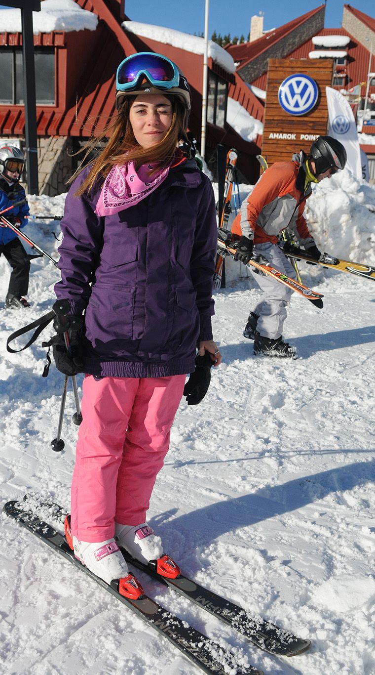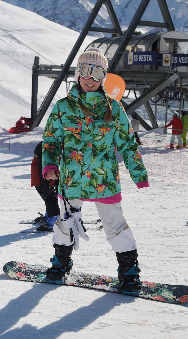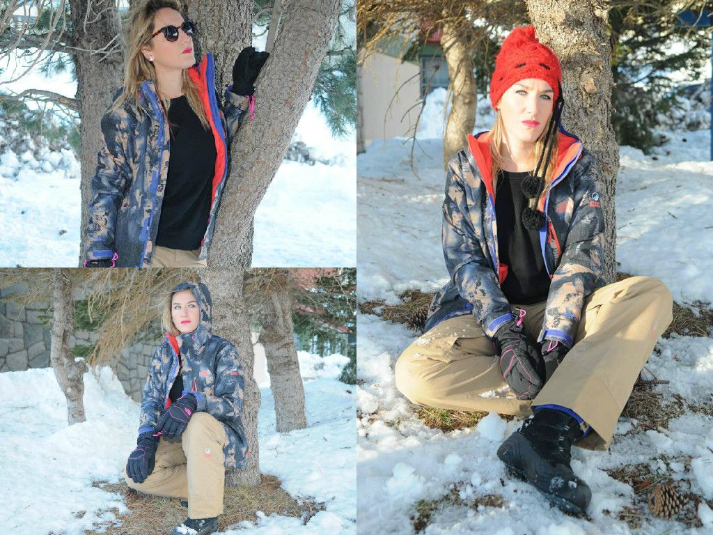 Una genia total. ¡Armar su look con una campera con estampa tropical, para la nieve, me parece una gran jugada! Excelente complementar con rosa y blanco que le dan femineidad y bajan toda la fuerza del camperón. Ni hablar de las antiparras con puntos ¡que amé!