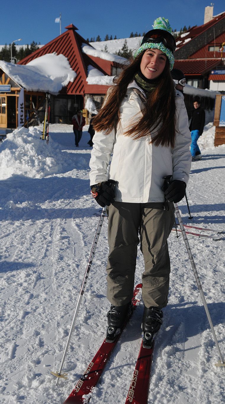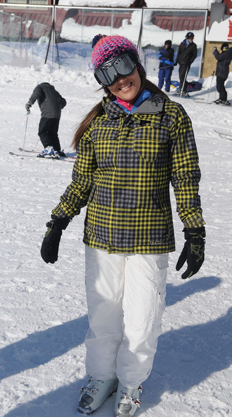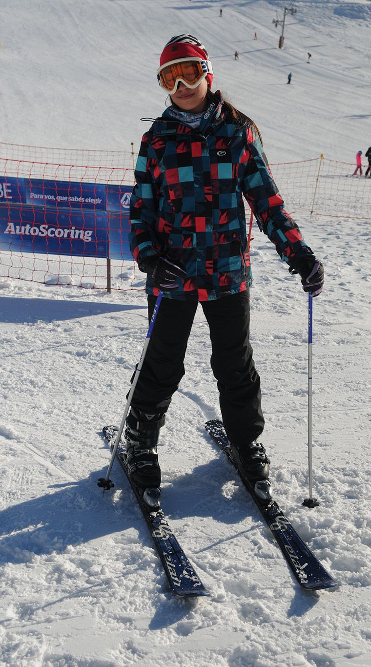 Una genia total. ¡Armar su look con una campera con estampa tropical, para la nieve, me parece una gran jugada! Excelente complementar con rosa y blanco que le dan femineidad y bajan toda la fuerza del camperón. Ni hablar de las antiparras con puntos ¡que amé!