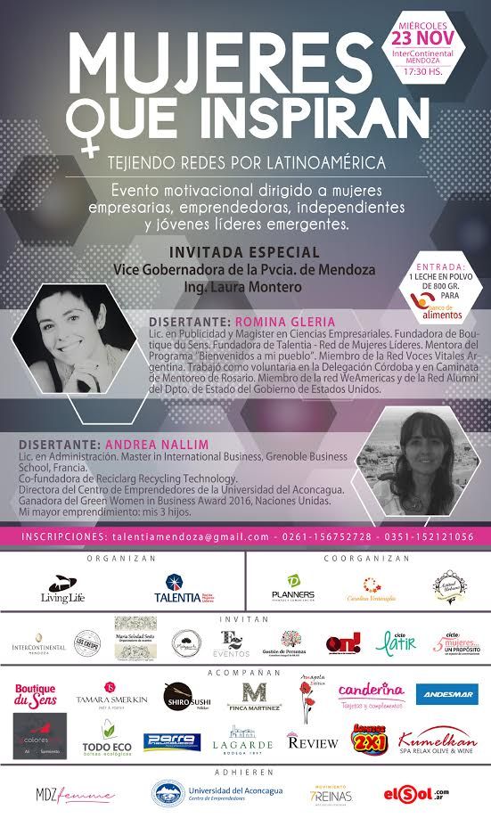 Creadora de RED TALENTIA. Licenciada en Publicidad y Magister en Ciencias Empresariales. Fundadora de Boutique du Sens - una línea de jabonería de diseño - (www.boutiquedusens.com.ar). Miembro de la red Voces Vitales Argentina. Trabajó como voluntaria en la Delegación Córdoba y en Caminata de Mentoreo de Rosario. Miembro de la red WeAmericas y de la Red Alumnio del Dpto. de Estado del Gobierno de Estados Unidos. En Agosto de 2016, participó del programa de intercambio profesional (I.V.L.P) WEAmericas, postulada por la Embajada de Estados Unidos en Argentina fue seleccionada junto a 18 mujeres líderes de Latinoamérica, y así formó parte de este programa destinado a fomentar el empoderamiento y la capacitación de las mujeres de América. Participó del Programa VVGROW -FELLOWSHIP 2015 -16 de la Fundación Vital Voices, un programa con formato de aceleradora de negocios, seleccionada junto a 69 mujeres de todo el mundo. Es oradora y brinda talleres de capacitación. -Andrea Nallin. Es madre de tres hijos. Lic. en Administración. Master in International Business ,Grenoble Business School . Francia. Co-fundadora de Reciclarg Recycling Technology.Directora del Centro de Emprendedores de la Universidad del Aconcagua. Ganadora del Green Women in Business Award 2016 de Naciones Unidas.