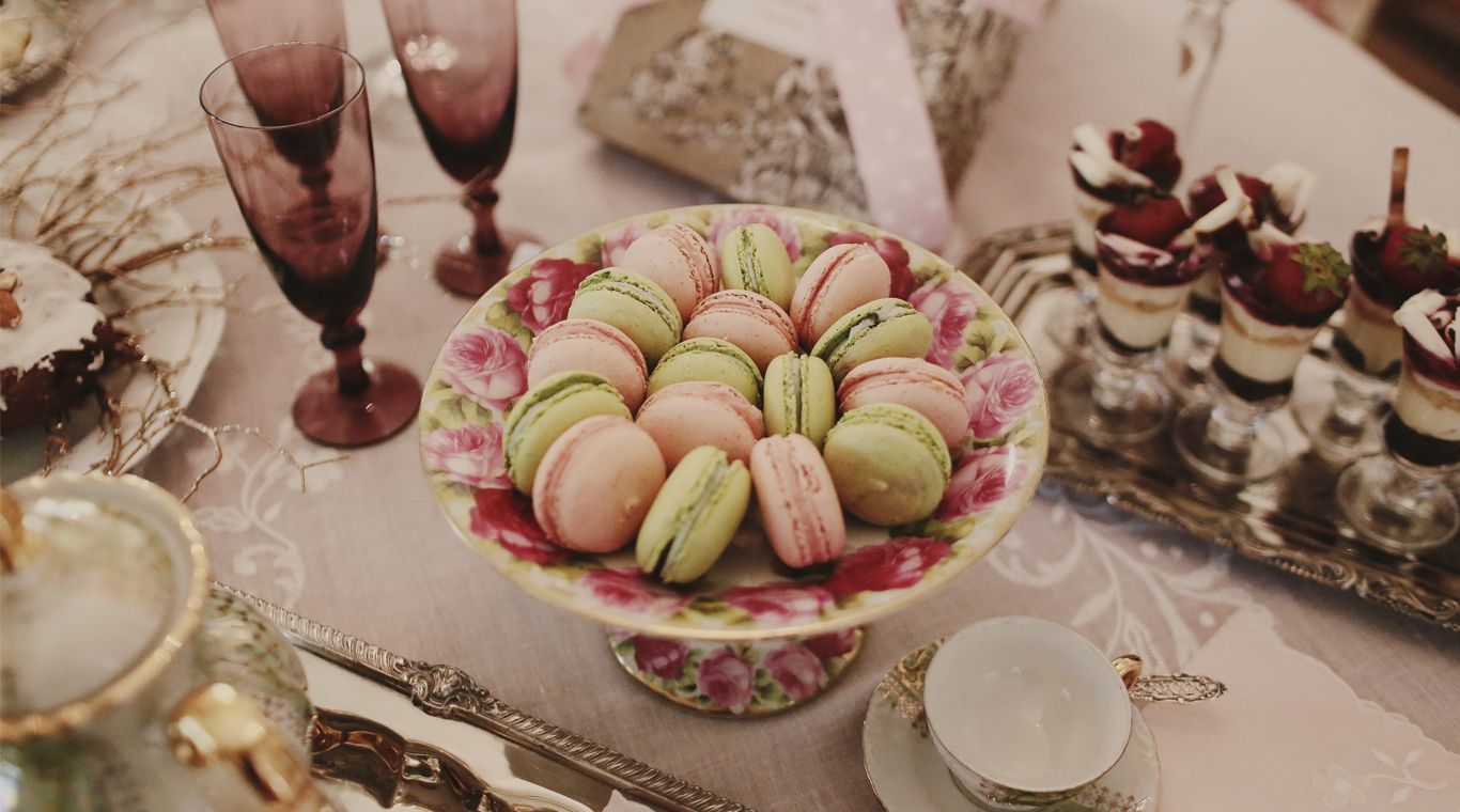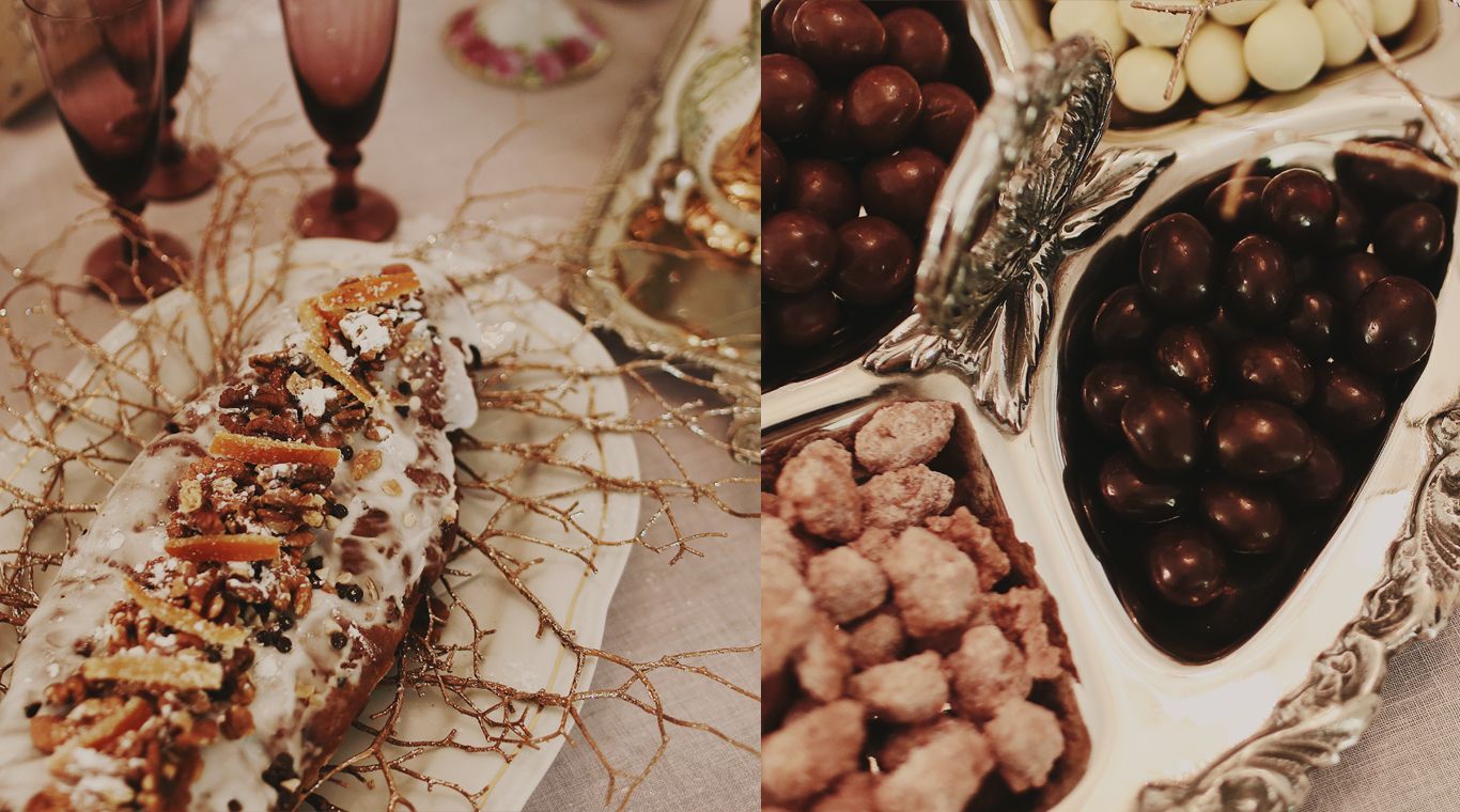 Esta mesa dulce, diseñada por Andrea Richardi, fue pensada para agasajar a los invitados después de las 12, pasado el brindis. Armada con un mantel de lino rosa pálido, juego de café de Bavaria en dorado y verde, servicio de platería Sheffield y copas y candelabros de cristal San Carlos, la mesa denota lujo y celebración sin caer en lo esperable para Navidad.