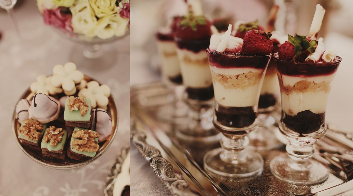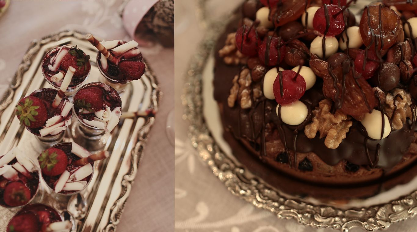 Los dulces son de inspiración europea: peladillas de almendras, macarons, masas danesas, budín inglés, castañas, pasas y almendras al chocolate, cheese cake en copitas, y como remate, el pannetone europeo -especialidad de la casa- relleno de castañas, nueces, almendras, pasas y frutas.