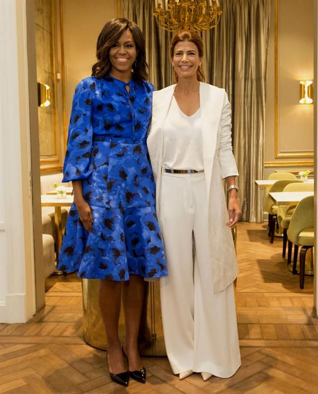 Para su arribo al país -al momento de bajar del avión, más puntualmente- la primera dama estadounidense eligió un diseño firmado por Narciso Rodríguez de su colección Primavera/Verano 2016, alterado a medida en línea A, con mangas ¾ y cinto para marcar la cintura y darle una forma armoniosa a su cuerpo.