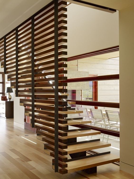 Tablas de madera que se disponen verticalmente como baranda, componen este tipo de escalera. Es un buen ejemplo donde se puede decorar el espacio y además utilizarlo como separador de espacios.