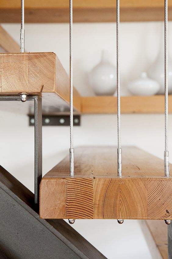 A través de tirantes de acero que van desde el techo, crean un efecto óptico que hace flotar la escalera. Los peldaños quedan atravesados con estos tirantes permitiendo su sostén. Además de cumplir esa función, también sirven en este caso, como “baranda” ayudando a la persona se sienta más segura.
