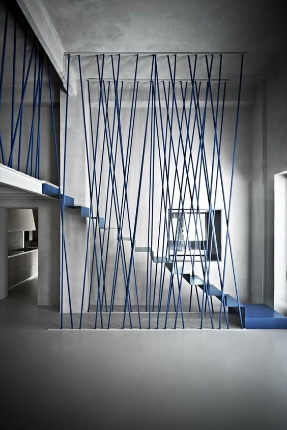 Para este diseño les mostramos dos variantes. Una desde al piso hasta el techo y el otro solo del pasamano al piso (imagen siguiente). En estos dos casos a diferencia de los anteriores, es solo estético. Es decir que no cumplen la función de sostener, sino de ayudar a que la persona no sienta el vértigo de la altura o porque no, de caer. Además los tirantes se ponen en evidencia al diseñarlos de un color distinto a la gama que ha elegido para el resto del ambiente.