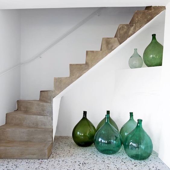 Esta escalera a simple vista no tiene nada que llame la atención. Pero si nos detenemos en los detalles que han utilizado descubrimos algunas cosas interesantes. El color blanco de los muros y vidrio de las botellas de decoración, ayudan a que el ambiente no se vea pesado y tosco. El concreto de los escalones muchas veces puede hacer que el espacio se vea pesado o encerrado. En cambio con estos detalles que han elegido, se logró un efecto óptico que nos hace ver el espacio más fresco.
