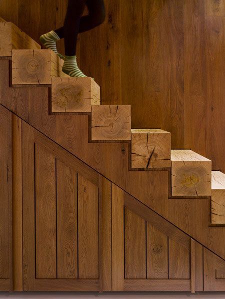 Esta escalera nos parece interesante, no solo por su material sino, por el diseño del muro que se hace parte de los escalones. Los mismos se encastran entre medio de los listones del muro, haciendo un juego de líneas interesante.