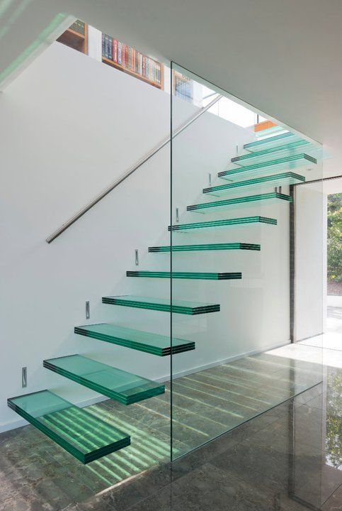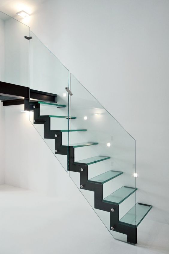 Uno de los beneficios de las escaleras de vidrio es que permiten el paso de la luz en espacios pequeños. Esta está compuesta por laterales en zigzag realizados en acero que permite sostenerse. Los pasos están compuestos de vidrio templado y laminado al igual que la baranda y los contrapasos se encuentran libres.