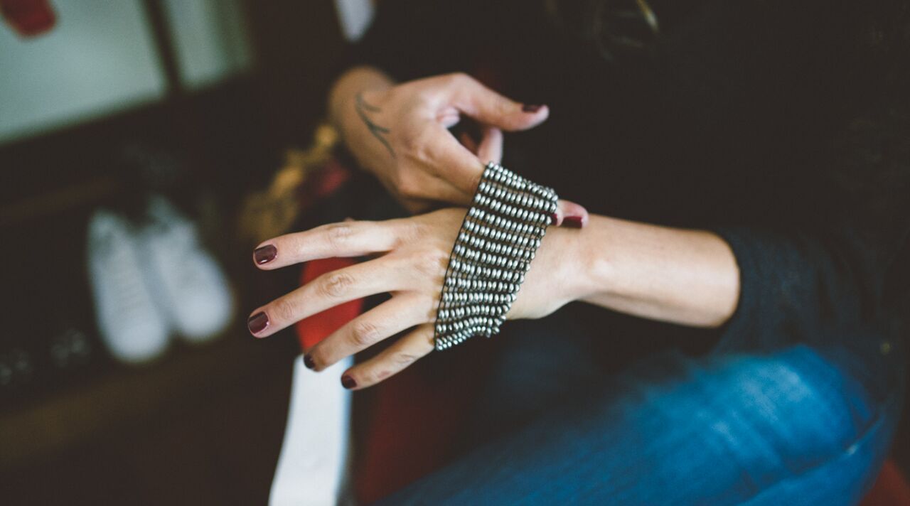 -De oro no uso nada, además los tonos dorados no son lo mío. De todos modos no uso muchos accesorios, tal vez algún collar de vez en cuando o pulseras, pero tienen que ser prácticas para que no me molesten cuando trabajo. Además ya tengo un tatuaje en el brazo, que es como un adorno, entonces tampoco me gusta sobrecargar. Ya casi no uso nada.