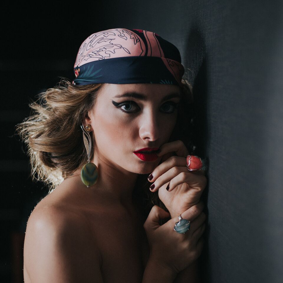 Pañuelo: The Dignani's. Aros y anillo: Mauricio Passerini Joyas.