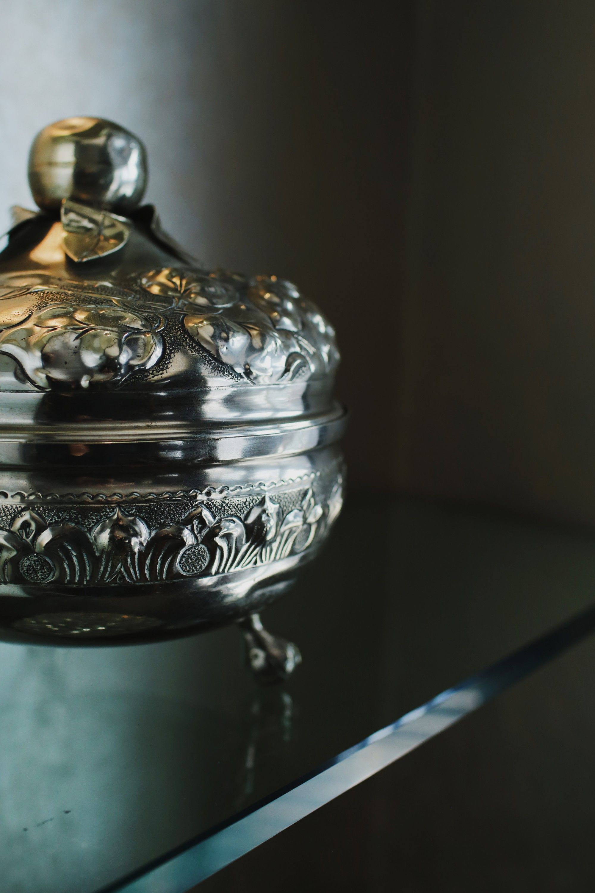 Los objetos tienen un gran trabajo de labrado, son en su mayoría dorados y contrastan con el fondo oscuro de los muros.