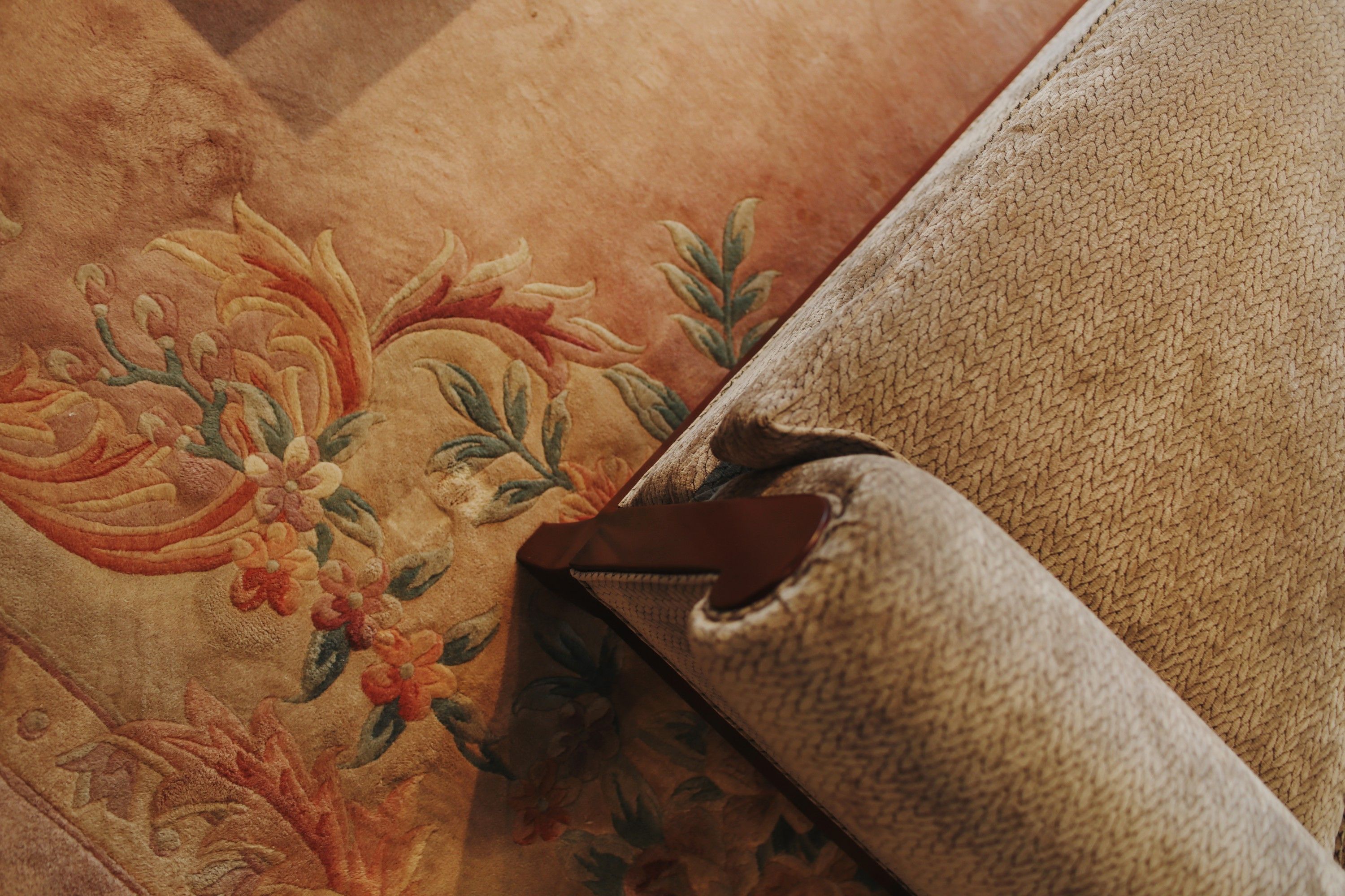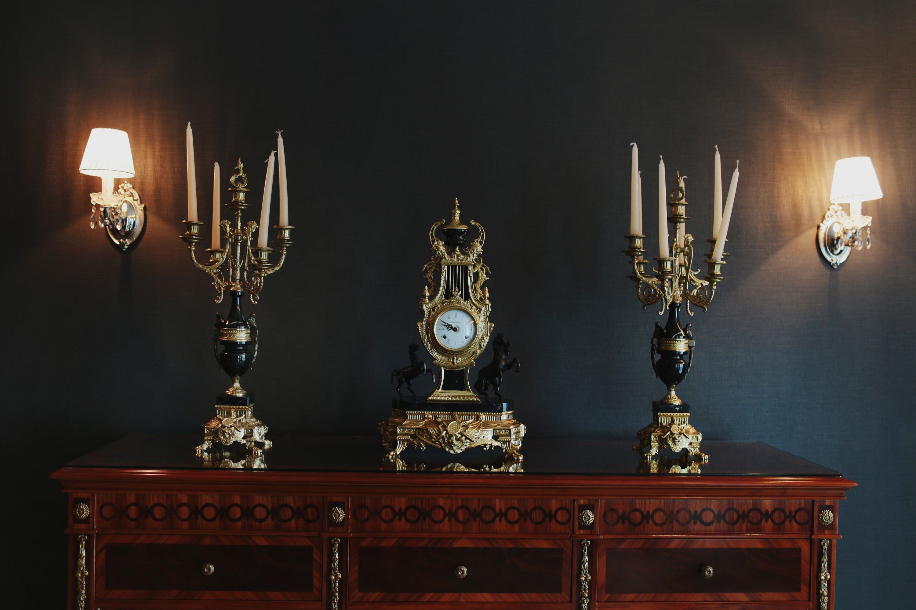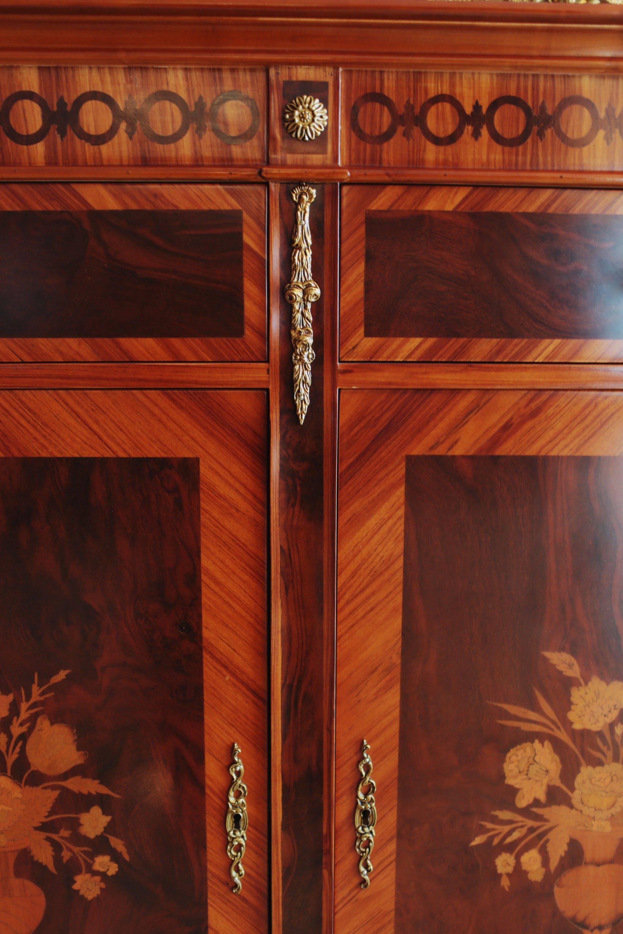 Detalle del mueble, diferencias de texturas de madera y apliques en dorado.