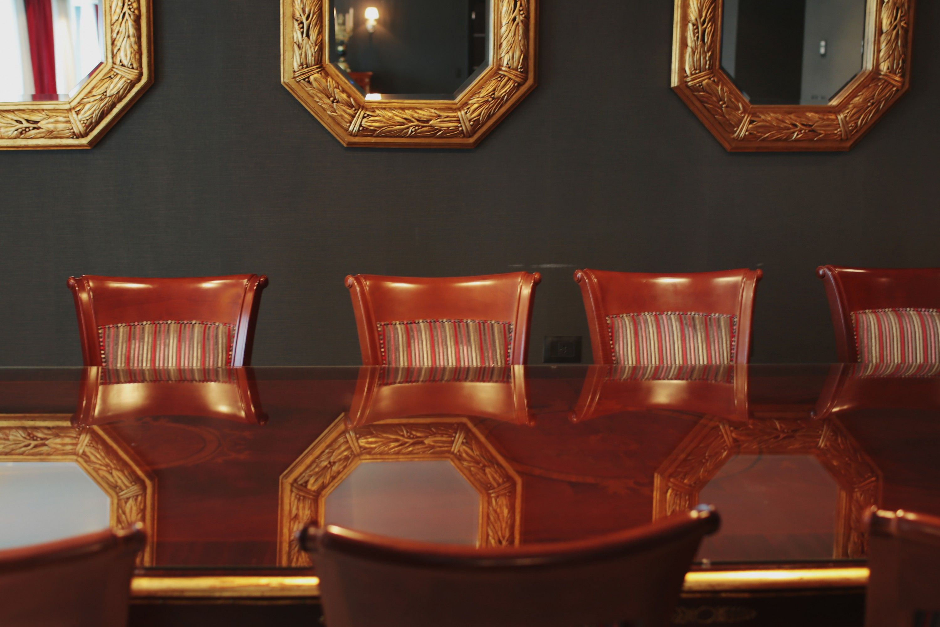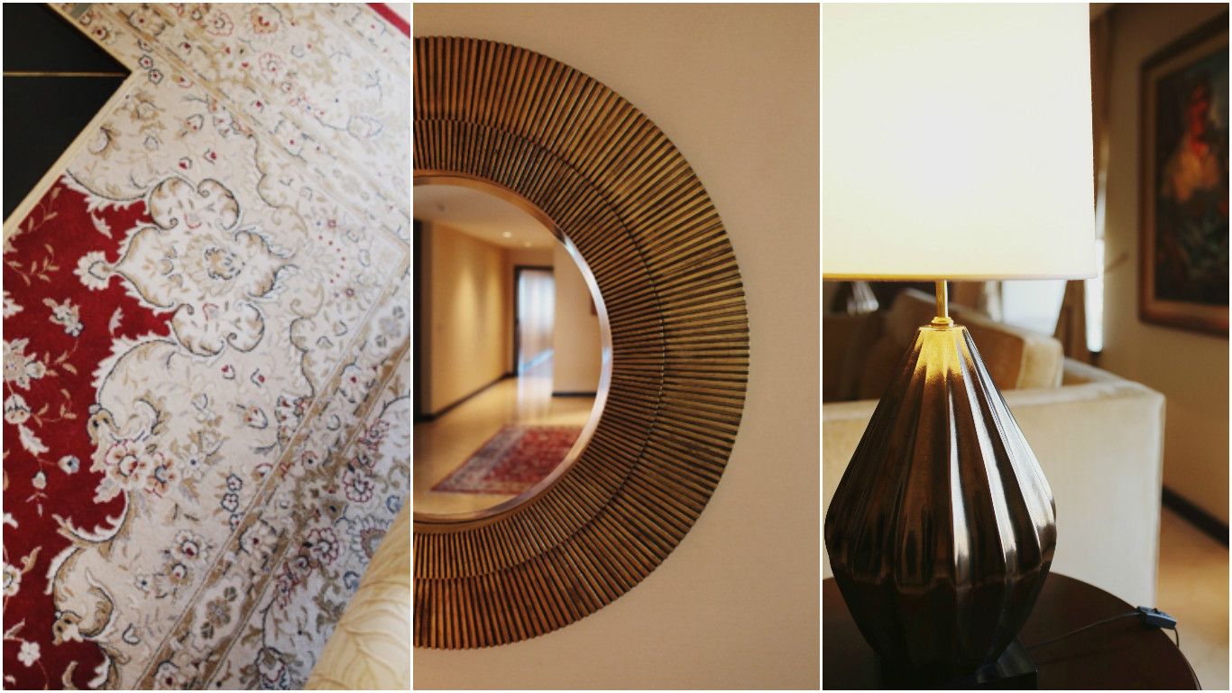 Esta mesa baja también tiene detalles dorados sobre negro, complementado con rojos de la alfombra que da elegancia al espacio.