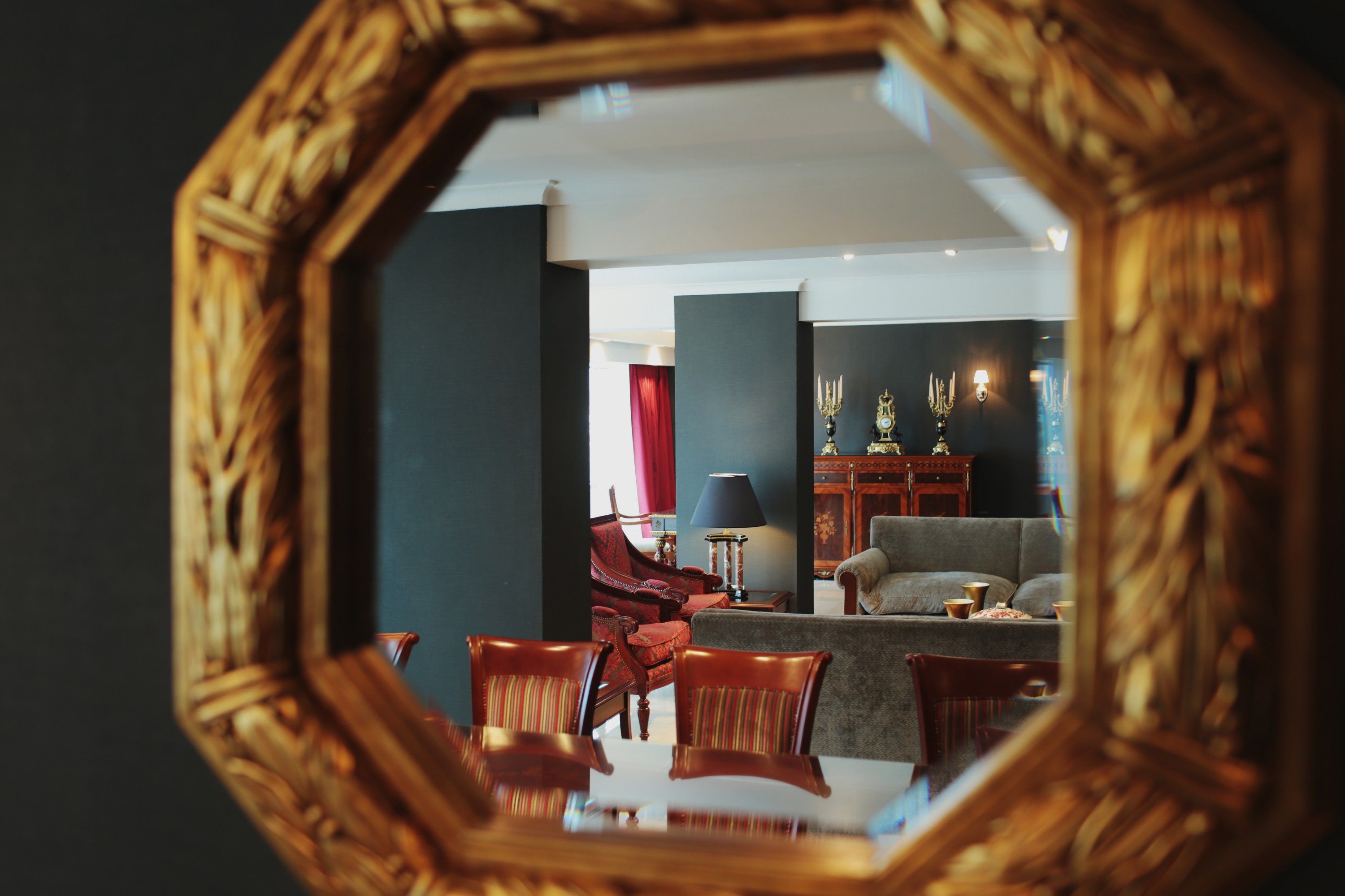 En el espejo se puede ver reflejado el ingreso a la habitación. El mismo es de una gran dimensión compuesto por rayos radiales dorados, que impactan y dan sofisticación al espacio.