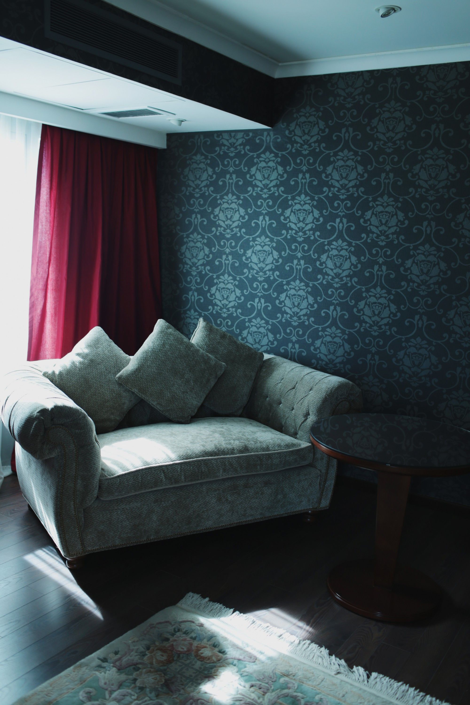 Todo el ambiente está empapelado de color gris grafito, lo que hace que los brillos y dorados resalten. Su diseño está compuesto por una gran alfombra clara con dibujos de hojas y flores de gran impacto que logra aclarar el espacio. Alrededor grandes sillones que invitan a relajarse con vista a la montaña. La sala de estar se encuentra ubicada en el centro del espacio.