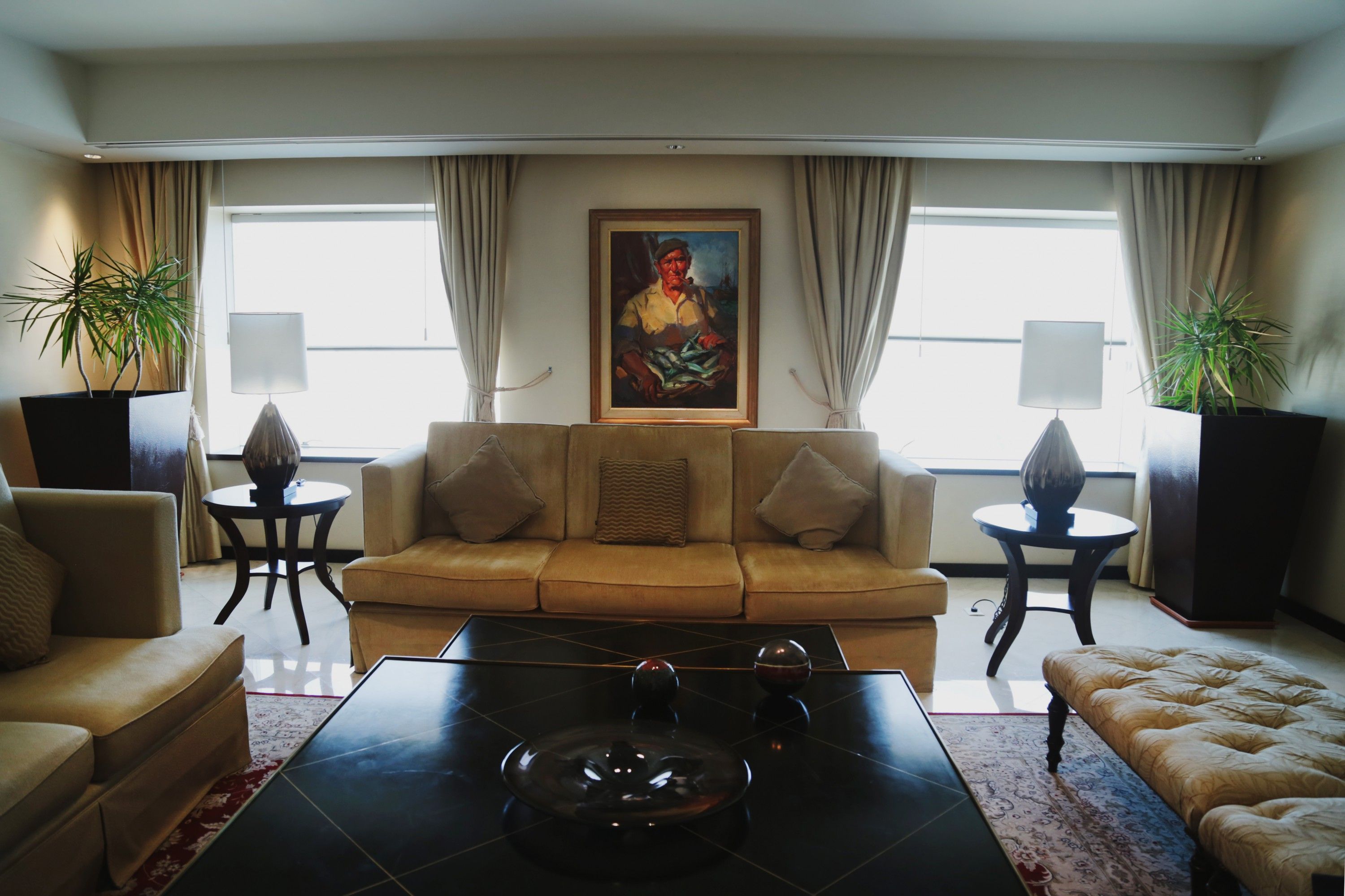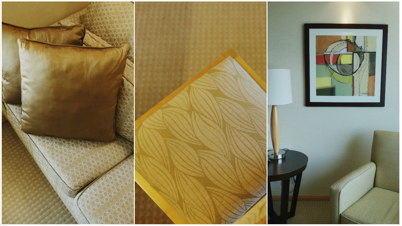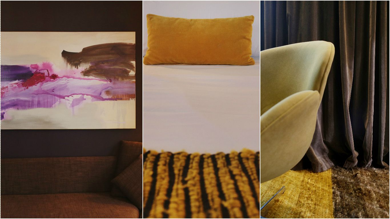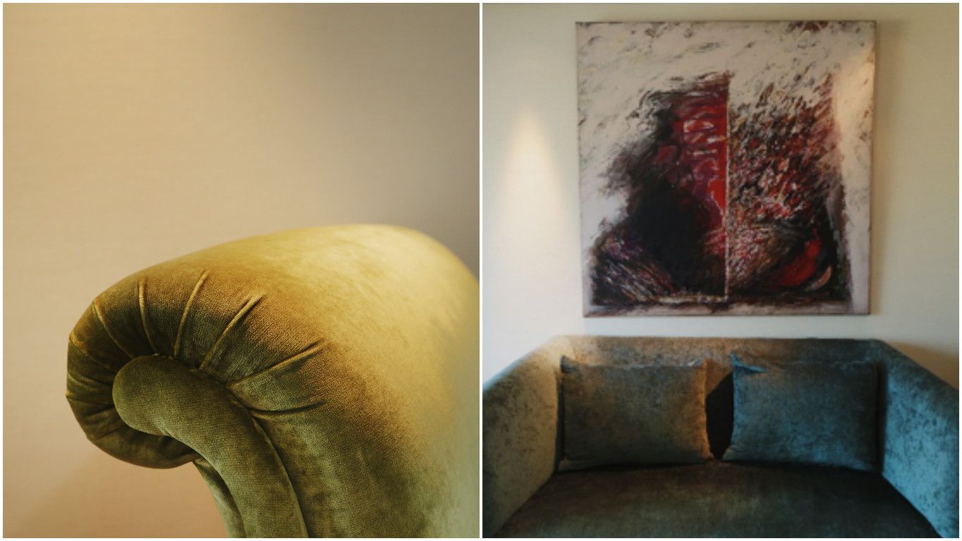 En la sala de relax nos encontramos con estos dos sillones de pana, que genera un muy buen efecto cuando entra la luz natural, realzando el brillo y la propiedad del género. Además este hotel en general se caracteriza por la presencia de obras de arte, específicamente cuadros, por lo que no faltan en ningún espacio.