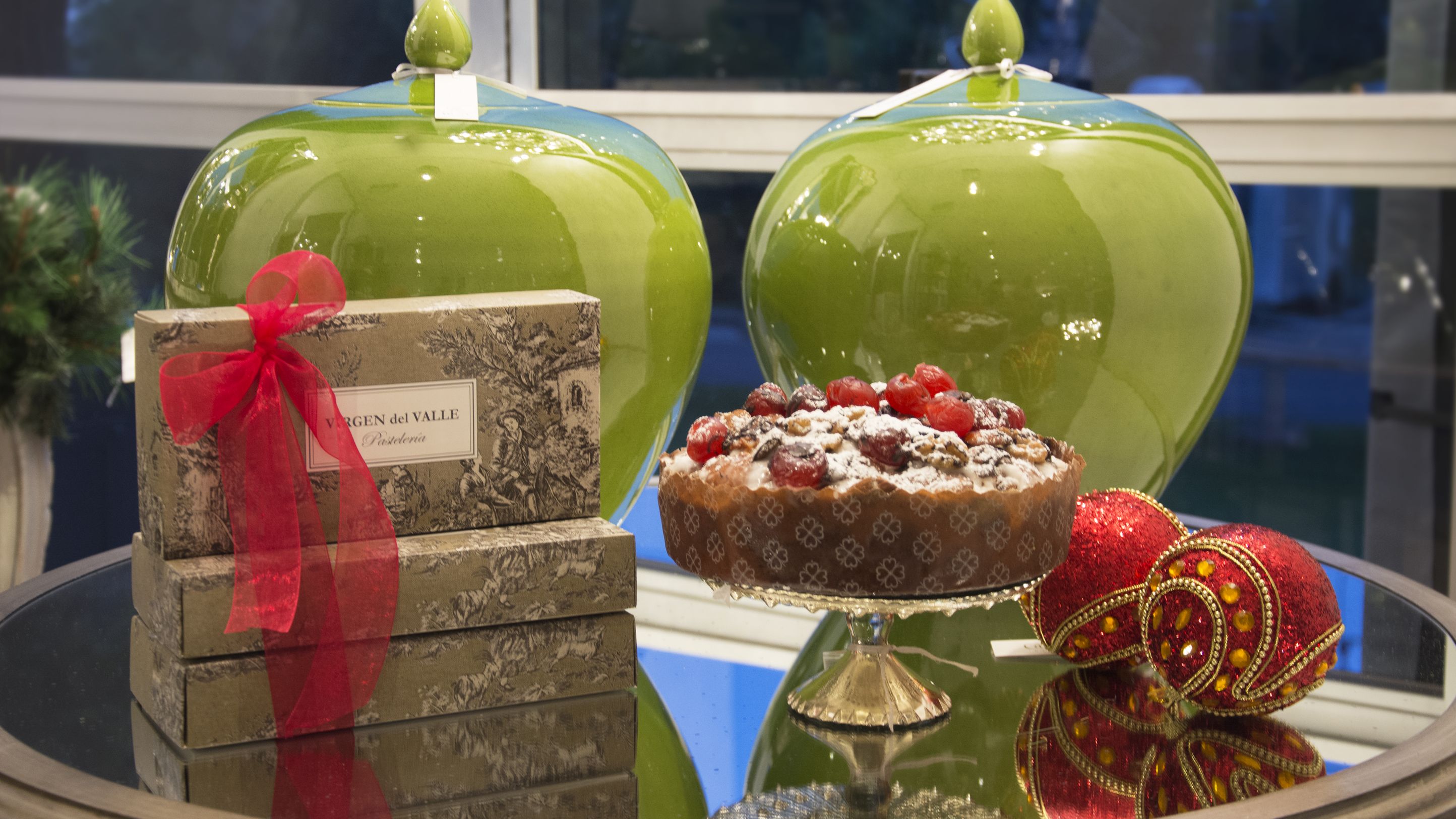 La mesa es redonda de espejos, con ánforas chinas esmaltadas en verdes. El Panettone de Navidad tradicional es estilo europeo, que está compuesto por almendras, avellanas, castañas.
