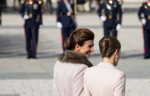 Las similitudes no terminaron en la ropa: tanto Juliana como Letizia optaron por maquillaje natural, cabello recogido -la primera dama argentina con un chignon hacia el costado, la reina con un sobrio rodete- y escarpines en punta color nude, Awada optando por el modelo rockstud de Valentino con tachas. Letizia acompañó su look con aros de diamantes incrustados, mientras que Juliana optó por no accesorizar.
