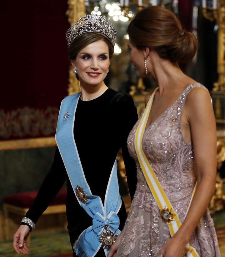 Letizia, por su parte, eligió un sobrio vestido negro al cuerpo de mangas largas, al que le dio el toque "real" con exquisitas piezas de joyería, incluyendo una diadema de platino y brillantes, imponentes aros de diamantes y un brazalete de piedras.