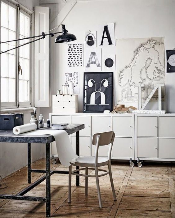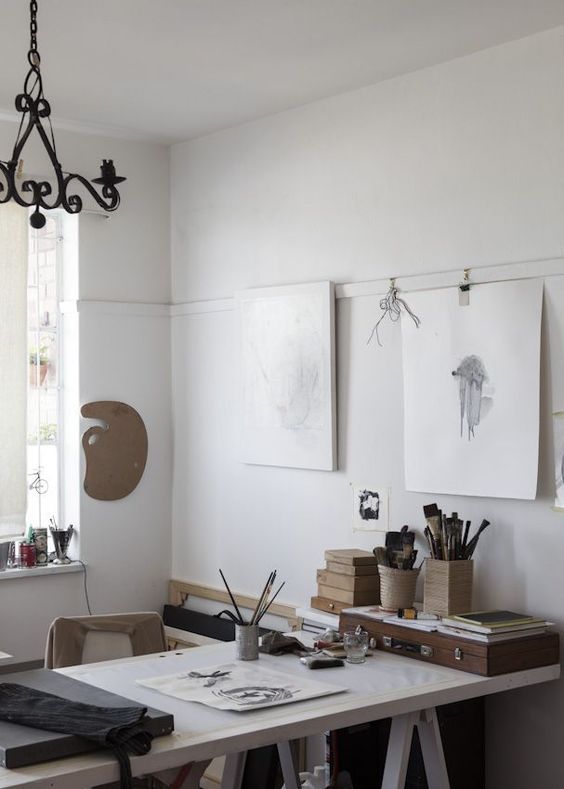 Elegir los colores no es tarea sencilla. Es importante que el lugar donde vayas a trabajar esté iluminado, aunque mucha luz puede llegar a causarte cansancio debido al exceso de luminosidad y brillo. En el ejemplo siguiente, cortan el blanco con elementos de madera, celestes y grises.