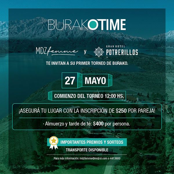 MDZ Femme y Gran Hotel Potrerillos te invitan a su primer torneo de Burako. La cita será el próximo, sábado 27 de mayo a las 12 horas, en el hotel que ofrece ¡la mejor vista!