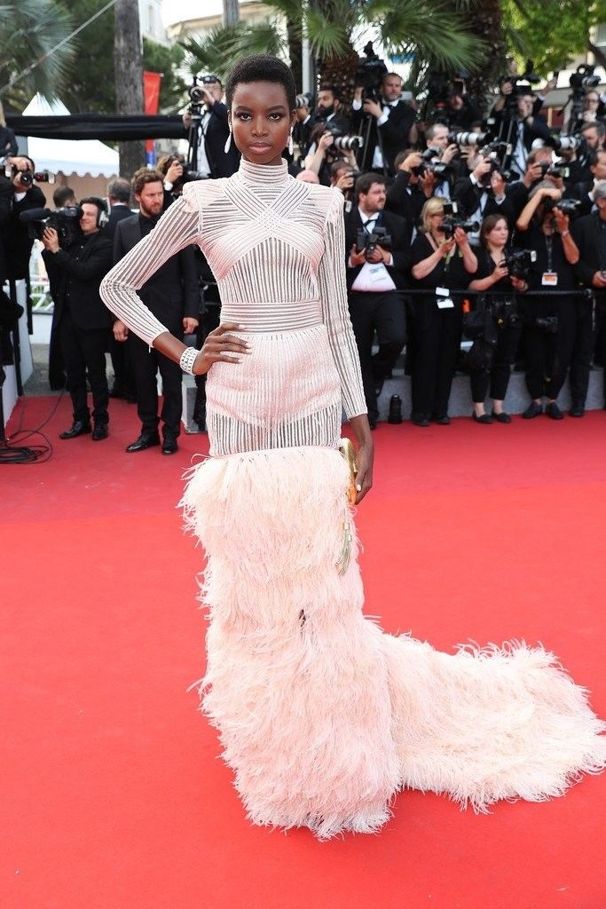 Muy osada escogió un diseño de Balmain, que tiene todas sus características: semitransparencias, hombreras, manga larga y una falda de plumas imponente. ¡Le sienta perfecto este rosa empolvado al tono de piel de la embajadora de L'Oréal!