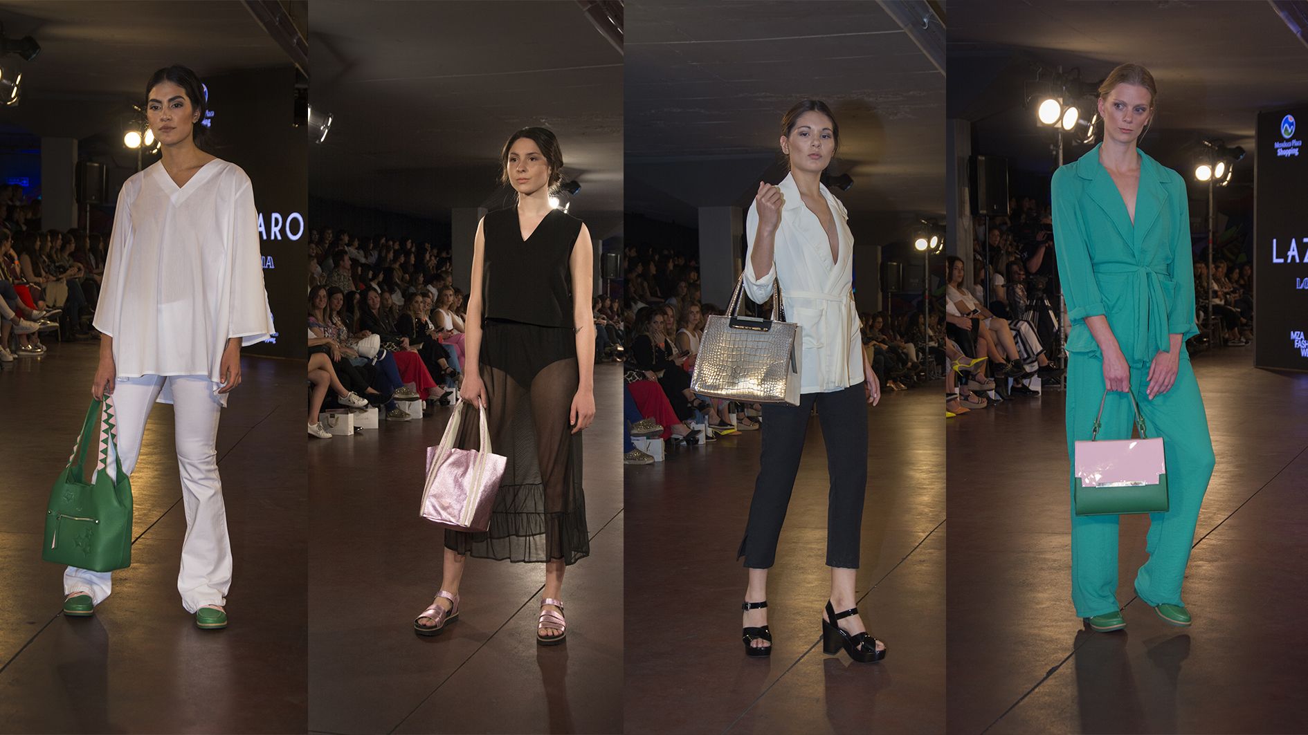 Siguiendo tendencias, los accesorios de Lazaro se reconocen por sus colores únicos como el verde esmeralda, azul Klein, fucsia y algunos metalizados. Loggia acompañó con transparencias, volados y mucho Black and White.