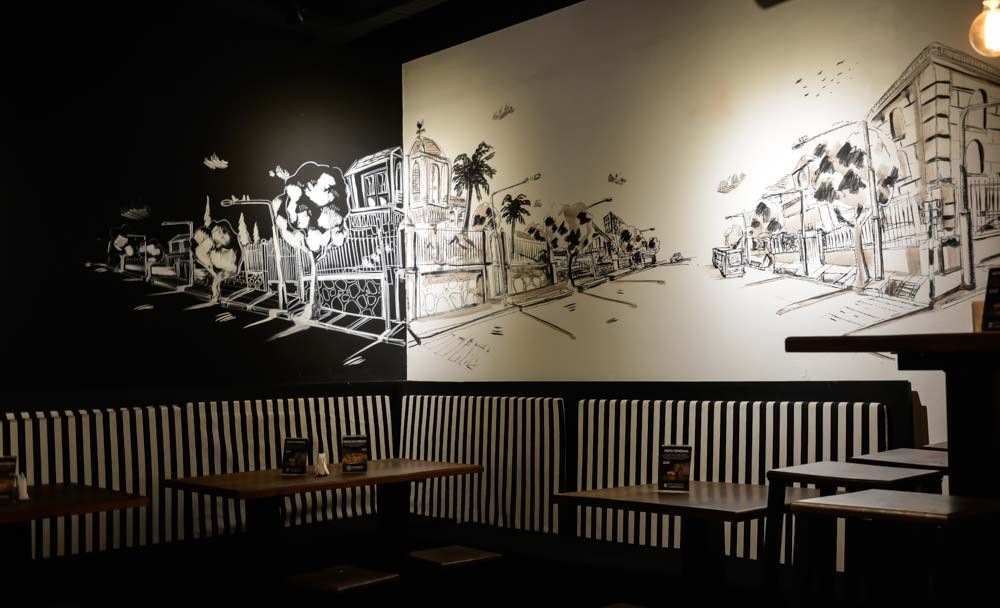 ¡Nos encanta este lugar como juega con las luces y sombras! Sin duda el centro de atención está puesto en los murales, donde los dibujos hacen énfasis en rincones de Mendoza. Como vemos en la imagen, pintada con blanco y negro y después al revés, generando continuidad en el dibujo.
