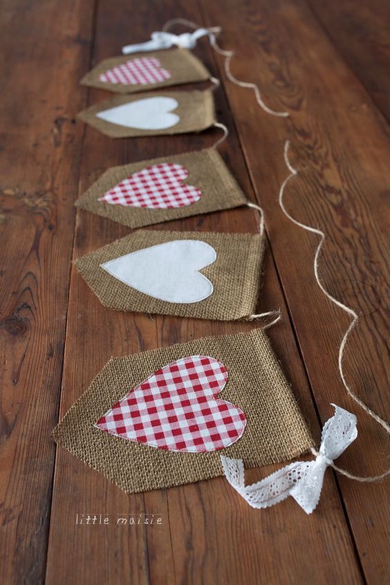 Dan aspecto muy lindo, y además es muy fácil de realizar. Las podes hacer con cartulina o algún género resistente para que se vea la forma. Por ejemplo, si usás arpillera podés pegarle arriba algo con cartulina u otro recorte que tengas en tu casa, en forma de corazón o lo que se te ocurra que pueda llegar a identificarte. Para colgarlo podés usar hilo, lana, cuerda o soga finita, etc.