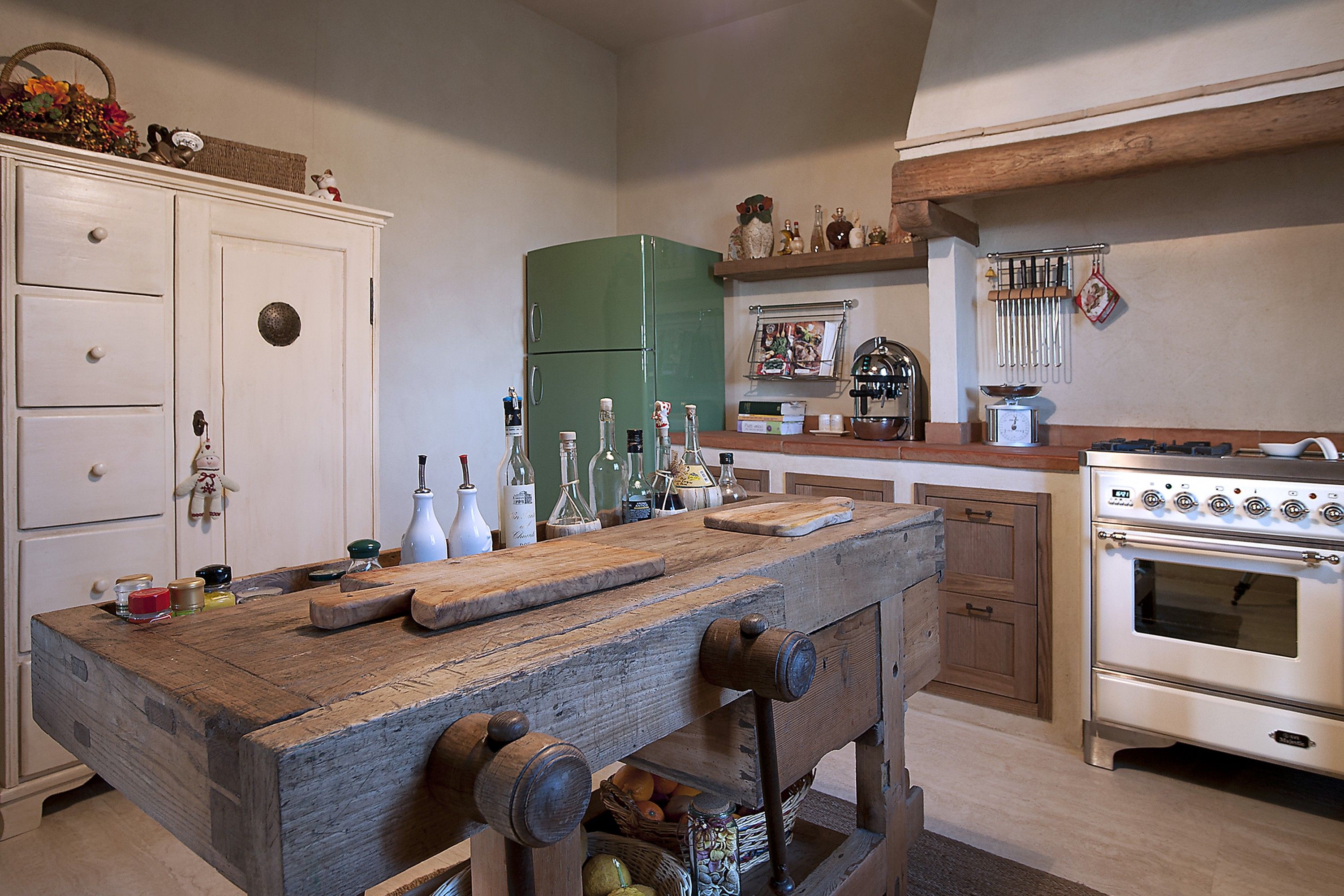 Ya sean nuestros propios muebles y adornos o algunos comprados en mercados de las pulgas o tiendas de segunda mano, para una cocina rústica genuina, la mayoría de los elementos deben evidenciar el noble roce del uso continuo. Es absurdo comprar muebles o accesorios recién fabricados y deliberadamente "envejecidos" cuando es tan sencillo encontrar the real thing. Objetos muy pulidos y que se vean nuevos no lograrán el efecto deseado.