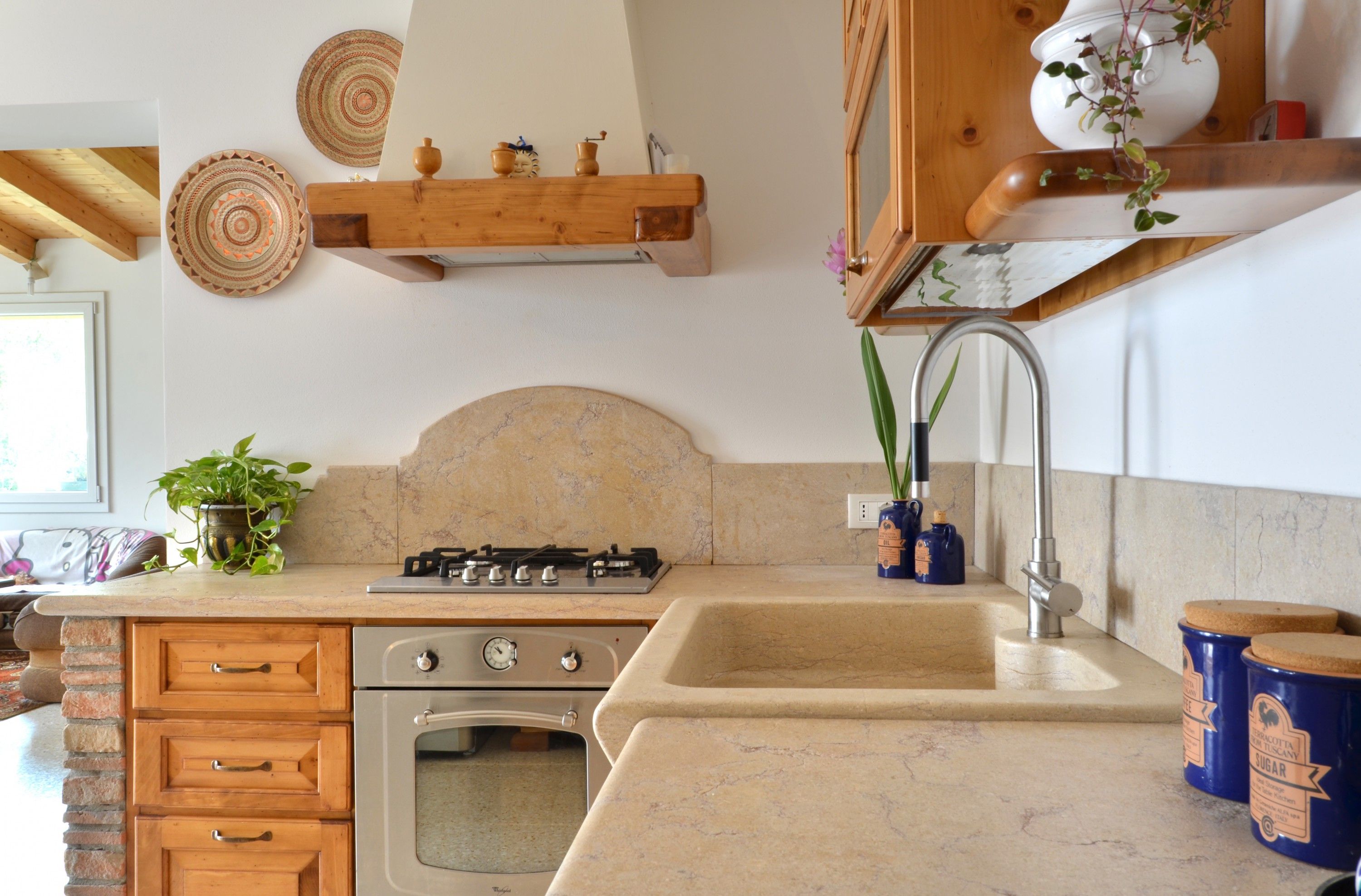 La piedra es un elemento muy usado en las cocinas rústica, sólo que se le da un lustre bastante diferente al que estamos acostumbrados. Un tope completo (bacha incluida) en mármol o granito sin tanto pulimento, logrará el look que buscamos, evitando que resignemos el uso de estos resistentes materiales porque "no nos dan rústico"..