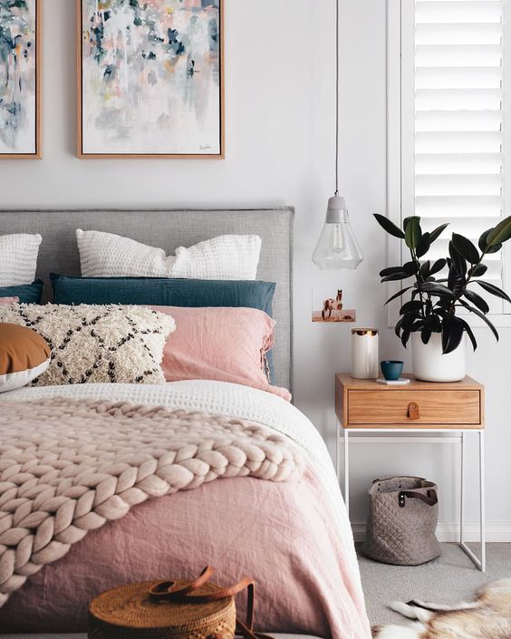 También se puede usar el color rosa solo para dar toques. Por ejemplo, en la primera imagen se da a través de la manta del sillón, sin predominar el color, sino al contrario rompiendo con los grises, verdes, naturales. En la segunda imagen se ve más claro, porque los colores contrastan más entre sí, combinando negro y grises oscuros.