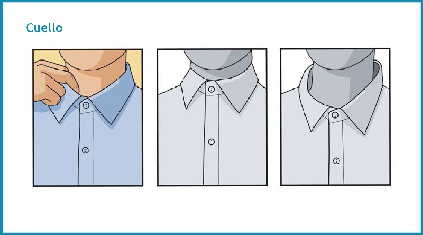 Cuello: una vez abrochado introducir dos dedos (entre tu cuello y el de la camisa) tienen que entrar cómodamente, si apenas entran: chico - si sobra espacio: grande.