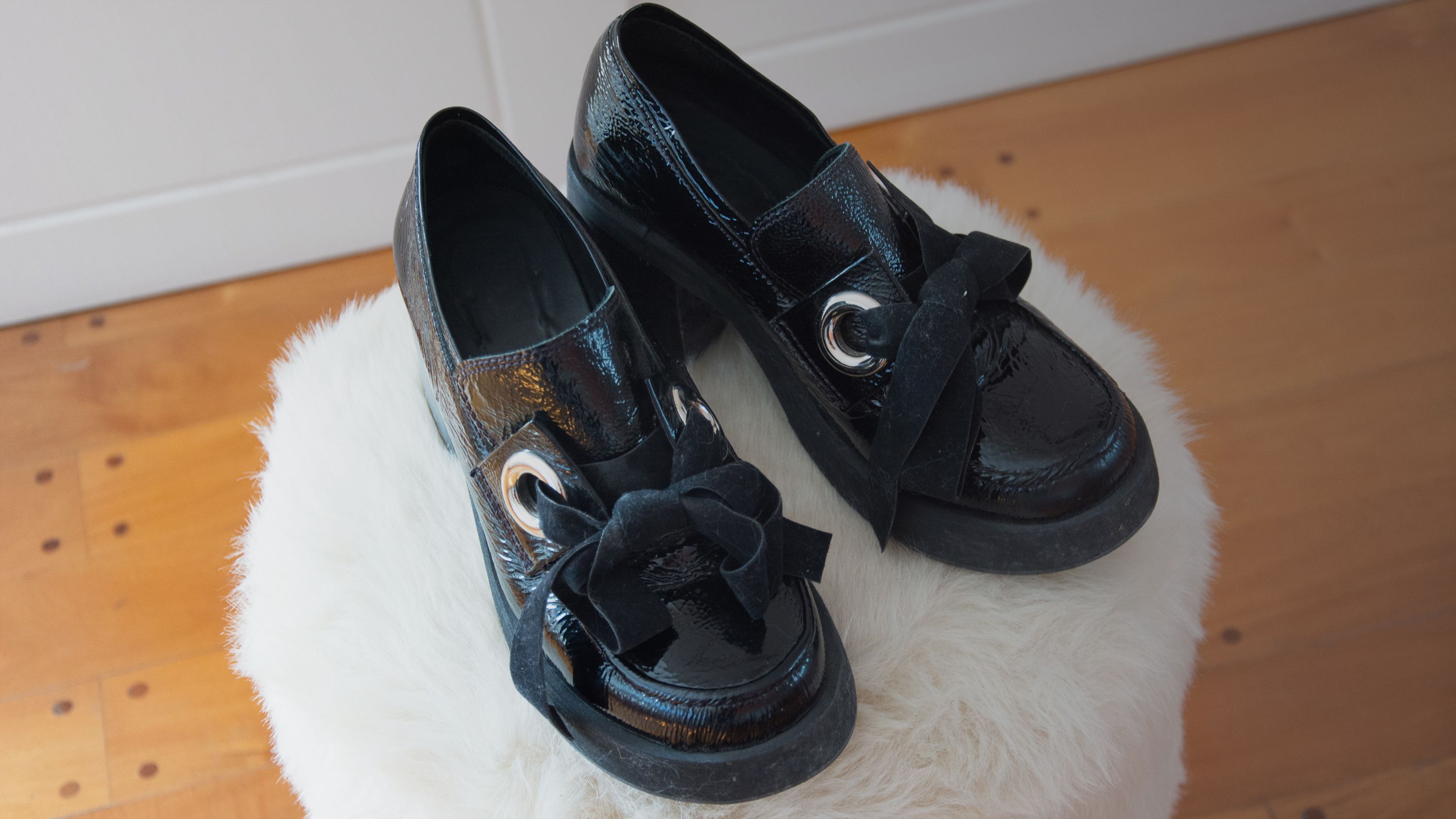 Si vamos por un par más formal elijo estos que tienen un poco de taco, lo cual me estiliza sin ser grotesco. Una ley que trato de cumplir al comprar zapatos es que no sobrepasen el tobillo ya que ese "truquito" hace que mis piernas luzcan más largas. Opte por unos acharolados, por la misma razón que dije desde el principio, es eso precisamente lo que los hace diferentes.