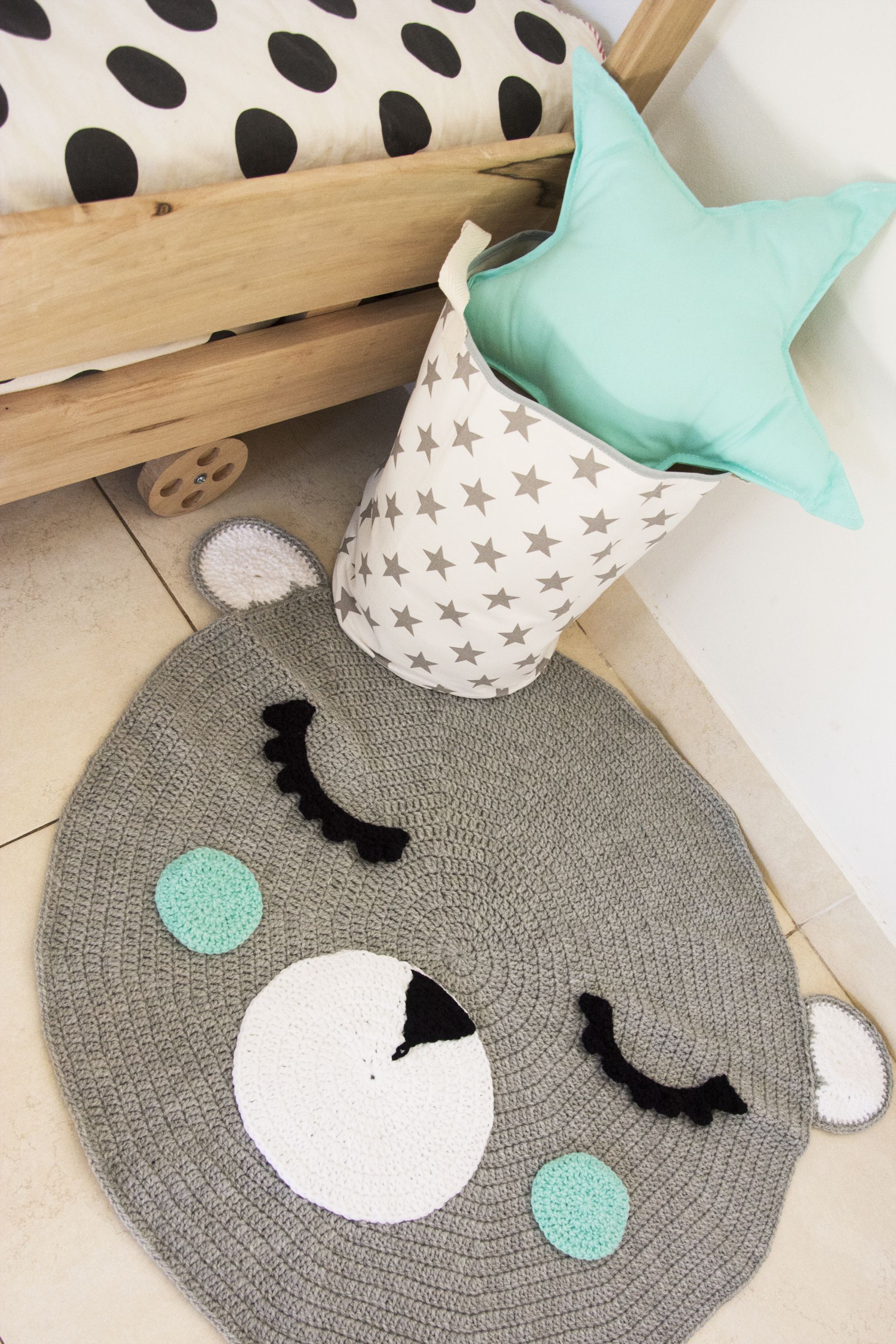 Estas alfombra tejidas de osito, son muy prácticas para los niños ya que pueden jugar sin que les de frío. También le pueden elegir el color a los cachetitos, en este caso elegimos unos que combinan con el almohadón en forma de estrella o sino vienen lisas con pompones.