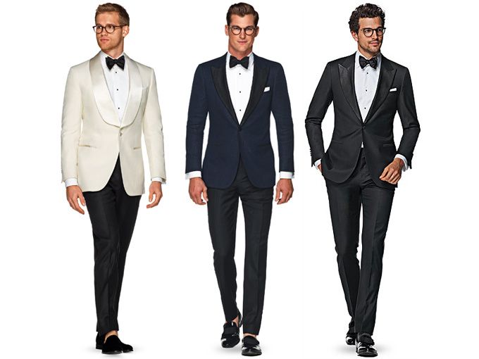 Hemos llegado al punto de la mayor expresión de la formalidad: la etiqueta. Aquí se impone el smoking con los accesorios que este implica. El textil sube el brillo, camisa cuello italiano, pajarita y zapatos de charol.
