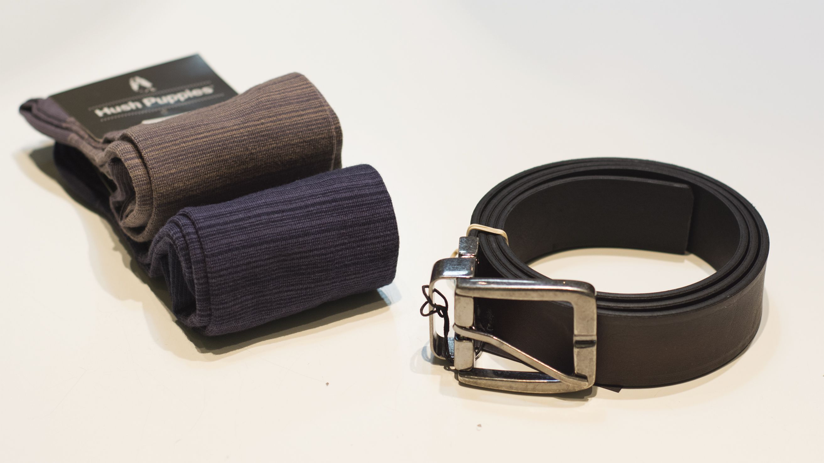 Los accesorios clásicos y que nunca están de más: Combo de dos medias Hush Puppies $290 y Cinturón de cuero reversible $490 Bufanda $650 y Billetera Hush Puppie $540