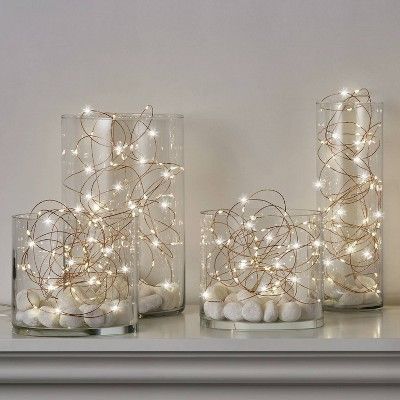 Si en tu casa hay algún recipiente transparente o fanal, quedan muy bien las luces de led. Si están desordenas y bien mezcladas quedan mejor.